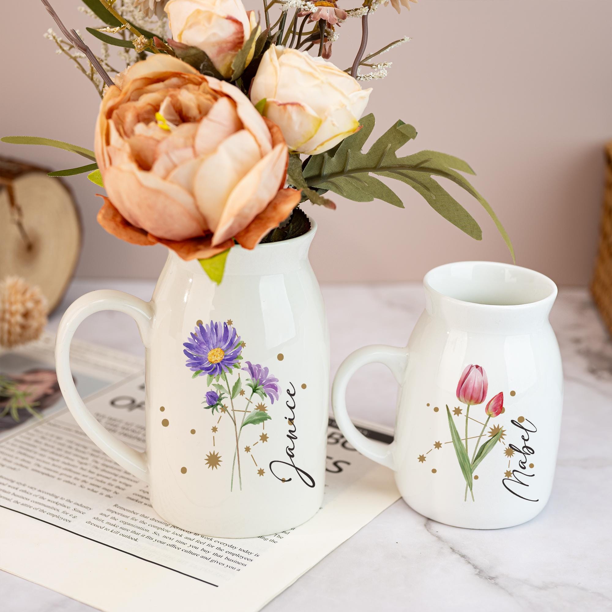 The Personalized Birth Flower Vase is a charming home decor piece that combines personalization with beauty. This mini ceramic vase can be customized with a recipient's birth flower and zodiac sign, making it a thoughtful birthday gift or a special surprise for any occasion.